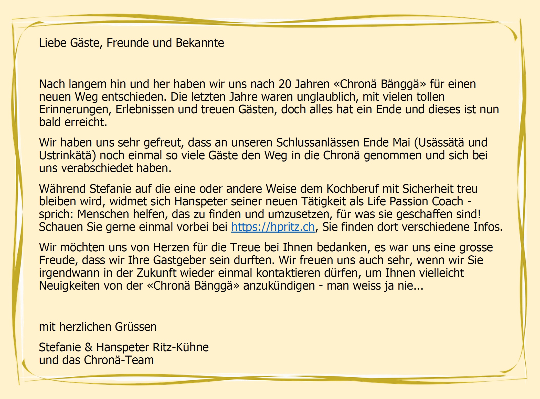 Und dies nun unter der Führung von Sämi Kühne, der tatkräftig unterstützt wird von Frau und Kindern. Wir wünsche Sämi viel "Gfreuts" mit dem Chronä Chäller!