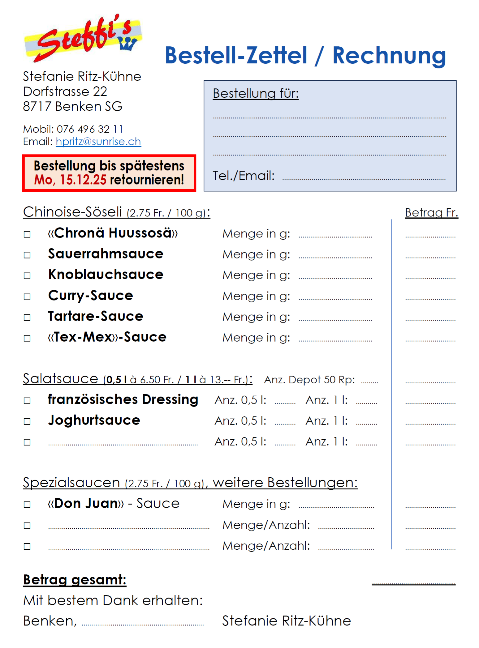 Auch dieses Jahr stellen wir für die Festtage Saucen her, welche Sie bestellen können gemäss folgendem Bestellzettel. Sie können mit einem Klick auf das Bild ein pdf herunterladen (mit zwei Bestellzetteln darauf), dieses ausdrucken, ausfüllen und uns retournieren. Ihre Bestellung sollte bis Montag, 15. Dezember bei uns eintreffen, damit wir Ihre gewünschten Saucen termingerecht auf Weihnachten produzieren können. Die Saucen werden an unserer Adresse (Dorfstrasse 22, 8717 Benken SG) zur Abholung bereitgestellt und sind einige Tage vor Weihnachten bereit (22./23. Dezember).